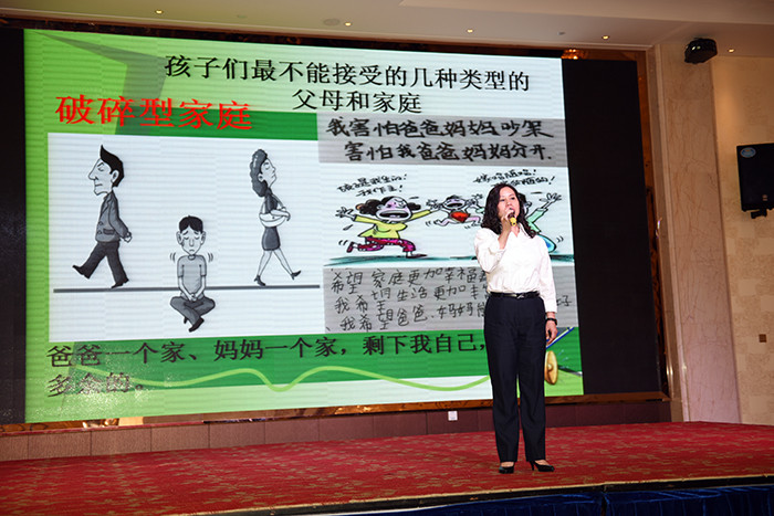 周老師本次培訓(xùn)的主題是《父母執(zhí)照—成為合格的父母》。父母作為孩子的人生啟蒙者,所擔(dān)負(fù)的教育意義不言而喻,而孩子的每個(gè)成長(zhǎng)階段都需要家長(zhǎng)積極地介入和引導(dǎo)。周老師引用了社會(huì)學(xué)家埃里克森著名的“成長(zhǎng)需要”理論闡述了孩子最重要的五個(gè)成長(zhǎng)階段,如果孩子沒(méi)有在某個(gè)階段充分成長(zhǎng),那么孩子將來(lái)的生活中就會(huì)感到困擾甚至是無(wú)能為力。如果孩子在每一階段都得到肯定和滿(mǎn)足,孩子的感受都能得到理解,孩子就會(huì)成為一個(gè)身心健康、接受自己的人。反之,孩子會(huì)形成反叛個(gè)性,成為人們眼中“最難教育的孩子”。周老師用通俗易懂的語(yǔ)言和形象生動(dòng)的圖片向家長(zhǎng)們呈現(xiàn)了一幕幕家庭教育案例,引導(dǎo)家長(zhǎng)正確識(shí)別和認(rèn)知家庭教育的缺失和偏頗,讓家長(zhǎng)們領(lǐng)悟正確的教育方式是孩子健康成長(zhǎng)的決定性因素。好父母是學(xué)出來(lái)的、好孩子是教出來(lái)的、好習(xí)慣是養(yǎng)出來(lái)的、好溝通是聽(tīng)出來(lái)的,和孩子建立和諧的親子關(guān)系,是靠平時(shí)在生活中一點(diǎn)一滴的累積,而不是一蹴而就的。沒(méi)有天生成功的父母,也沒(méi)有不需要學(xué)習(xí)的父母。雖然做父母的確不需要考個(gè)執(zhí)照,但是,如果不學(xué)習(xí),就不可能成為一個(gè)合格的父母!周老師用感人肺腑的語(yǔ)言,朗讀了孩子寫(xiě)給家長(zhǎng)的信,深深感動(dòng)了在場(chǎng)的家長(zhǎng)們,多次熱烈的掌聲和感同身受留下的淚水把培訓(xùn)會(huì)氣氛推到了一個(gè)高點(diǎn)。