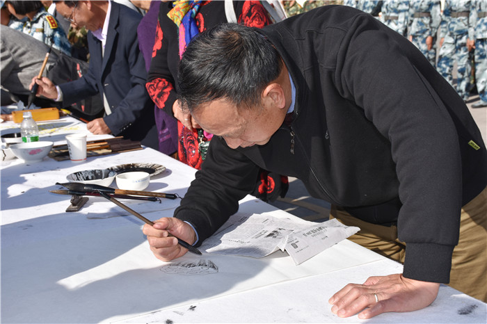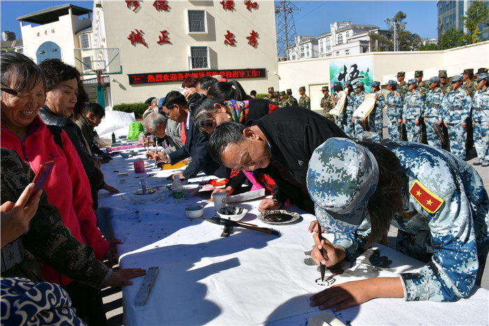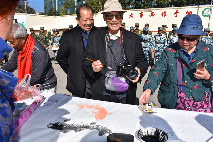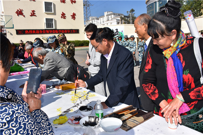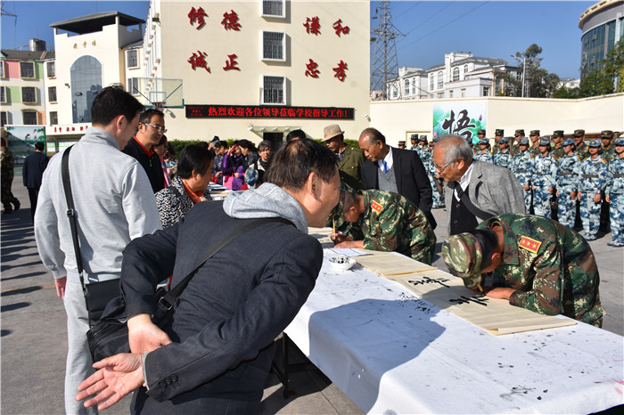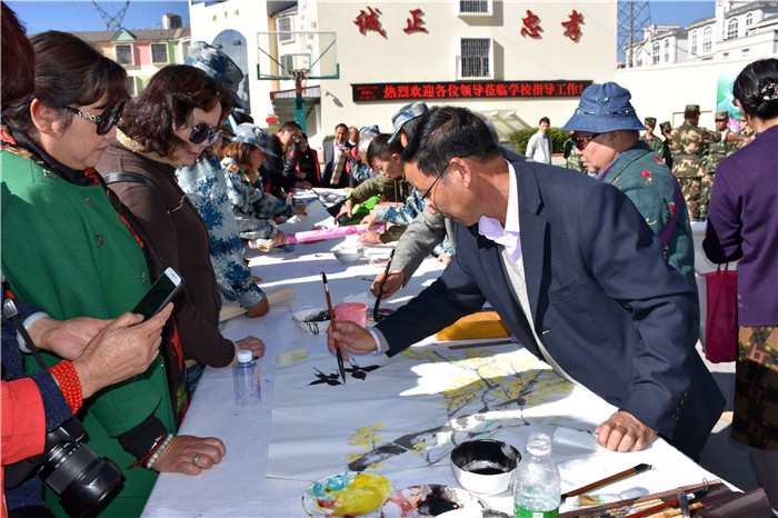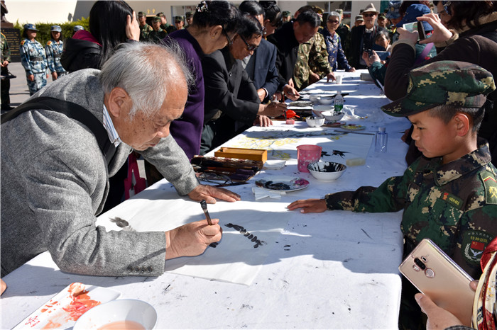 緊接著,聽說老領(lǐng)導(dǎo)們都身懷絕技,在繪畫、書法上都頗有造詣,孩子們豈能錯過這樣的好機會。在領(lǐng)導(dǎo)們觀看教學(xué)片時,孩子們早早就把筆墨紙硯準備好,列隊等著請教學(xué)習(xí)。領(lǐng)導(dǎo)們觀看結(jié)束,一出教學(xué)樓就看著齊排排的學(xué)生圍在書法桌周圍等待他們,也不禁興致勃勃想檢驗下孩子們的日常所學(xué)。