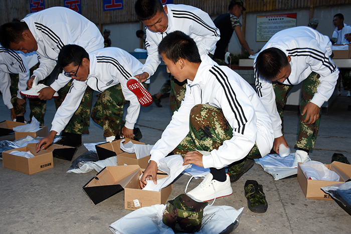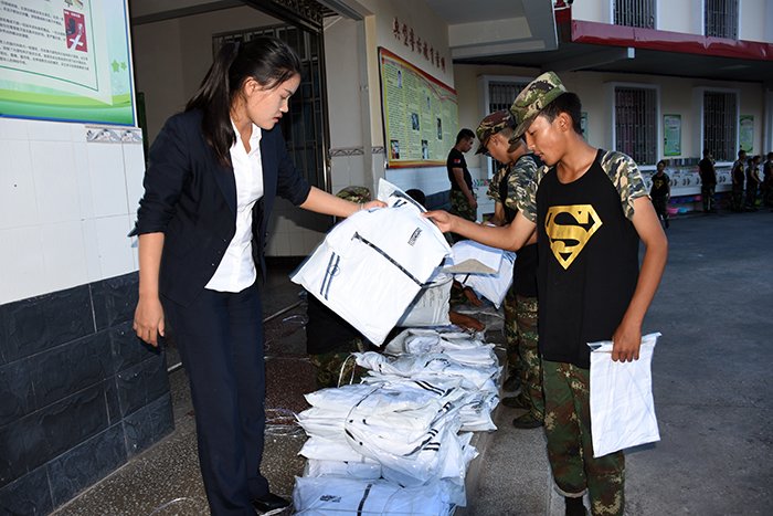 領(lǐng)到新裝的孩子非常興奮,不時(shí)說(shuō)著“真好看”、“好喜歡”、“好漂亮”、 “太幸福了”之類(lèi)的話語(yǔ),并迫不及待地?fù)Q上漂亮的校服,站在鏡子面前,左照照、右照照,是那么合身、那么帥氣、那么有朝氣。你瞧,潔白的T恤和外套,配上黑色的褲子,加上白色運(yùn)動(dòng)鞋,既莊重又活潑,既樸素又大方。我校使用的迷彩服和運(yùn)動(dòng)服作為指定服裝,相得益彰,一個(gè)嚴(yán)肅,一個(gè)休閑,正好符合學(xué)校的“嚴(yán)管理,善對(duì)待”的教學(xué)理念,更體現(xiàn)了學(xué)校的人文關(guān)懷。