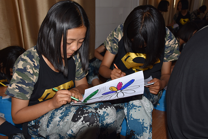團(tuán)輔課緊扣主題,通過玩游戲、講故事、寫心愿等形式展開。首先,通過“破冰”活動(dòng)快速讓學(xué)生進(jìn)入狀態(tài),打破學(xué)校以班級(jí)為單位的心理定勢(shì),融化學(xué)生人際間的壁壘。隨后,周老師講述了心理健康的標(biāo)準(zhǔn)和心理問題的演變,使學(xué)生清晰了解自己的心理狀態(tài),并使存在心理問題的學(xué)生及時(shí)認(rèn)識(shí)到自己的問題,在早期積極面對(duì),避免在錯(cuò)誤的道路上越走越遠(yuǎn)。緊接著,孩子們根據(jù)周老師設(shè)計(jì)的“我的生活信念”、“我現(xiàn)在的困擾”、“人生最大的一次成功和失敗”、“我的將來”等問題,手繪七色花,將關(guān)鍵字寫在七色花里并上色,并與同伴展開激烈討論,針對(duì)討論給予反饋。