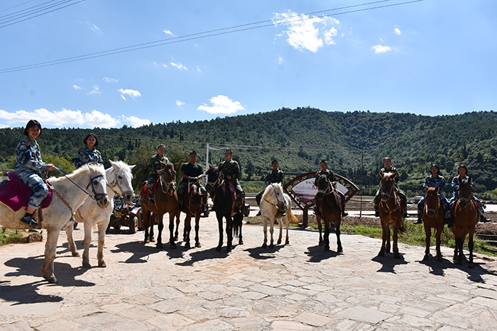 美美地享受了一頓美食之后,孩子們迫不及待地來到了牧羊湖?粗裂蛉藸恐拇篑R,大家興奮不已,躍躍欲試。有的想立馬去選一匹愛駒,充當一個騎士,體驗一下馬背上的豪情,不時腦補了很多大草原上騎馬馳騁的畫面;有的望而卻步,生怕從馬上摔下來;有的甚至害怕馬。但在牧馬人講解騎馬的技巧和動作后,在老師的鼓勵下,加上牧馬人在身旁牽馬隨行,確保安全。孩子們頓時就自信起來,做起了馬背上的騎士(宛若貴族王子公主),不自覺的抬起頭,展開視線,昂揚地看著奇美無比的秋日燦陽,一起沿著鏡湖、村落穿行踱步,追尋秋的腳步。