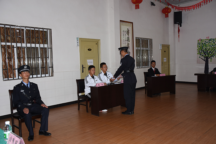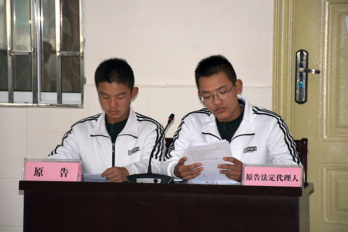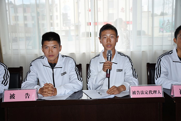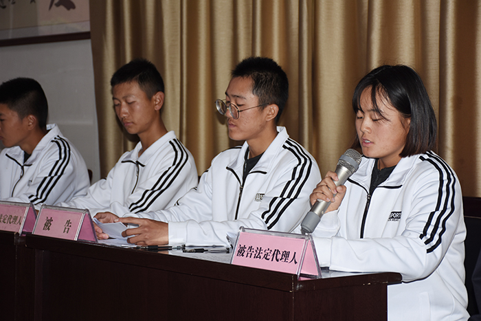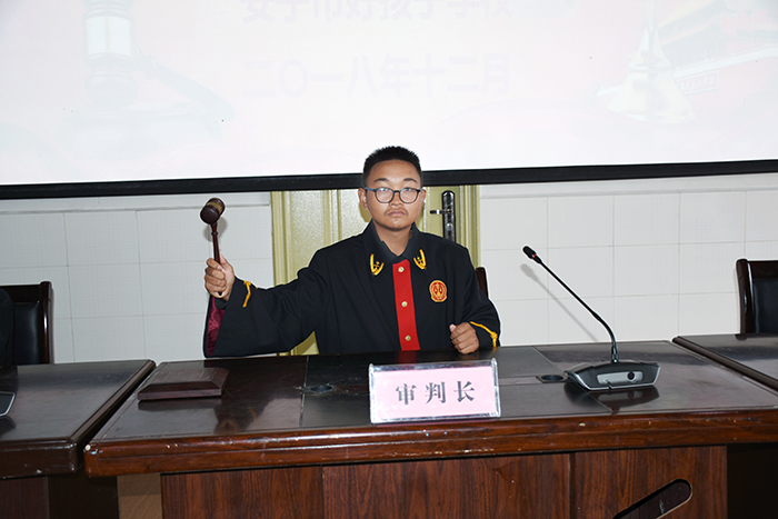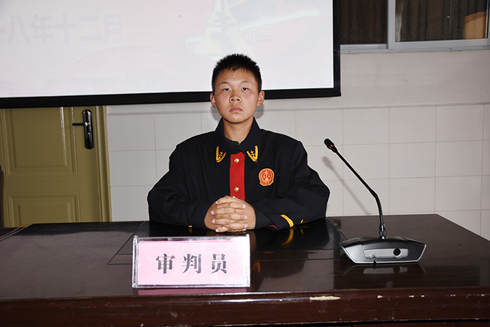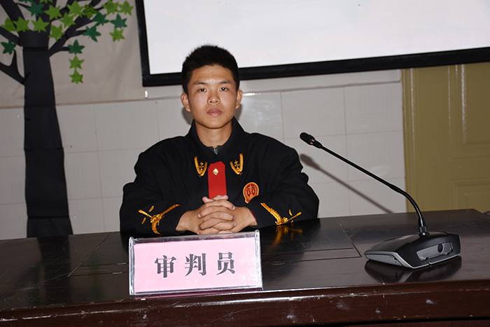 上午10時(shí),隨著“小法官”一聲清脆的“現(xiàn)在開庭”的法槌聲,一場特殊的庭審活動(dòng)在學(xué)校多媒體教室正式拉開序幕。由字然等16名學(xué)生分別飾演的審判長、審判員、書記員、原告、原告法定代理人、被告人、被告法定代理人、法警等法庭訴訟角色,開始了莊重、肅穆的庭審。