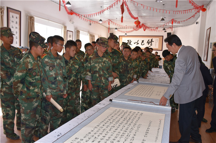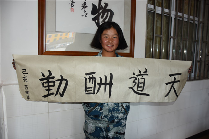 比賽尾聲,魯校長還把孩子們中間寫的好的書法裝裱,拿到現(xiàn)場展示,勉勵孩子們要向榜樣學(xué)習(xí):“同學(xué)們,這是你們的同學(xué)寫的書法,他們就生活在你們中間,離你們并不遙遠。他們?nèi)胄r也和大家一樣,什么都不懂,甚至連如何握筆都不知道,但經(jīng)過幾個月的學(xué)習(xí),進步顯而易見。不但字寫得好,而且心境也更加寧靜平和。我常常和大家說‘練筆,就是練心’,一個人如果僅僅把字練得爐火純青,他也只能成為‘書匠’,只有把握中華文化這個根基、深入體會中華文化中詩書禮樂的共性、領(lǐng)會經(jīng)典與美學(xué)的意義,才能可能成為真正的大師。所以,我也希望同學(xué)們能在這里靜下心來,好好學(xué)習(xí),寫端端正正中國字,做堂堂正正中國人!”