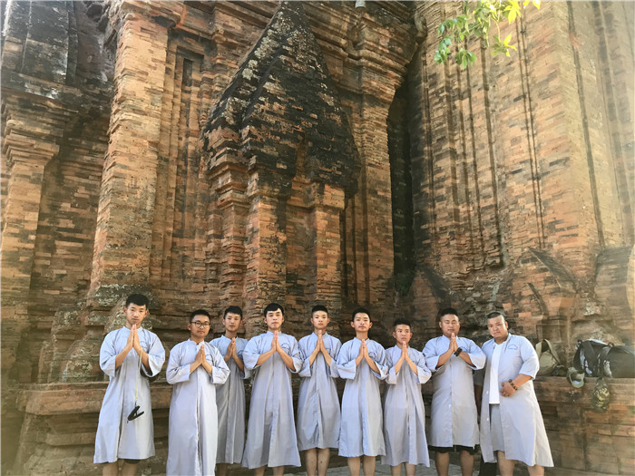 根據(jù)行程安排,孩子們9號(hào)到達(dá)目的地后,卸下航程的疲憊,美美睡了一覺,10日一大早品嘗了當(dāng)?shù)氐拿朗澈,便前往參觀芽莊最重要的歷史遺跡——占婆塔。這座隱藏在芽莊的“小吳哥窟”,站在其頂部平臺(tái)眺望,芽莊碧藍(lán)的海港都盡收眼底。這里信奉師婆,受印度文化影響很深。印度教徒稱占婆女神是印度教希瓦神的化身,越南佛教徒稱她為天依女神,保護(hù)著靠海吃海的漁民,相當(dāng)于中國漁民心目中的媽祖。不斷更疊的歷史,讓曾經(jīng)這座占婆人的神祗在各種文化親潤下發(fā)生著變化,今天的遺址上,既能看到歷史變化的痕跡,也能體味到越南人民宗教信仰的永恒。
