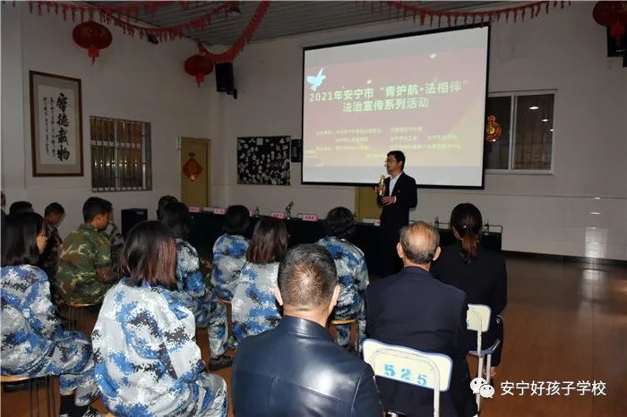 為加強(qiáng)青少年法治教育和思想道德教育,預(yù)防和減少未成年人違法犯罪,提高未成年人自我保護(hù)能力,推進(jìn)依法治市,建設(shè)平安安寧, 2021年4月9日上午, 由市委政法委、共青團(tuán)安寧市委、市人民檢察院、市關(guān)工委、市未司辦主辦,安寧市向日葵青少年事務(wù)服務(wù)中心、安寧好孩子學(xué)校承辦的“青護(hù)航•法相伴”法治宣傳系列活動(dòng)在我校多功能室舉行。市委政法委副書(shū)記李劍飛、市人民檢察院第四檢察部主任孫曉宇、市關(guān)工委專職副主任李庭貴、團(tuán)市委副書(shū)記徐濟(jì)炳、市人民檢察院和市關(guān)工委部分“五老”成員等領(lǐng)導(dǎo)出席了本次活動(dòng);顒(dòng)由團(tuán)市委副書(shū)記徐濟(jì)炳主持。