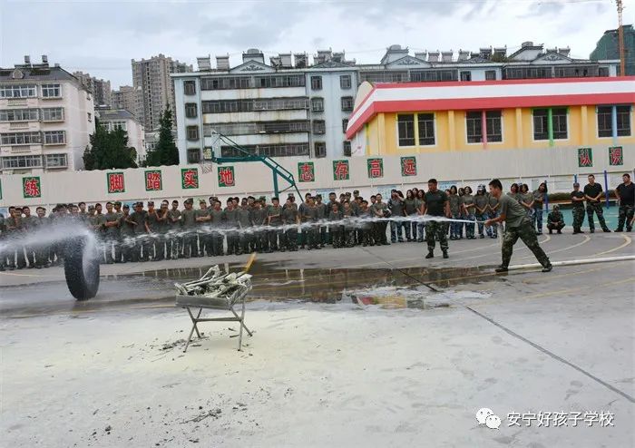 最后,進(jìn)行了撲救演練。操場上的木材點燃后,火苗迅速變成了熊熊大火,老師開始現(xiàn)場演示滅火設(shè)備(滅火器、高壓水槍)的使用方法,并指導(dǎo)全部學(xué)生親自操作演練。