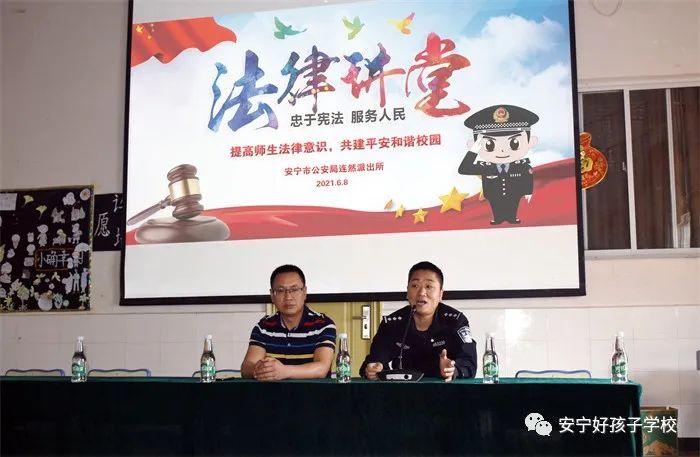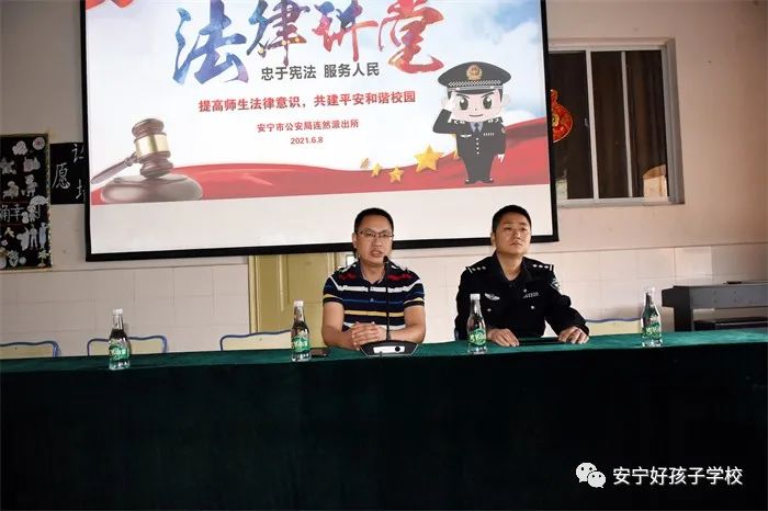 為進(jìn)一步深入學(xué)習(xí)踐行習(xí)近平法治思想,弘揚(yáng)法治精神,增強(qiáng)全校師生法律意識(shí),共建平安和諧校園,2021年6月8日,我校特邀安寧市公安局連然派出所吳濤警官為全校師生上了一堂精彩生動(dòng)的法制教育課。