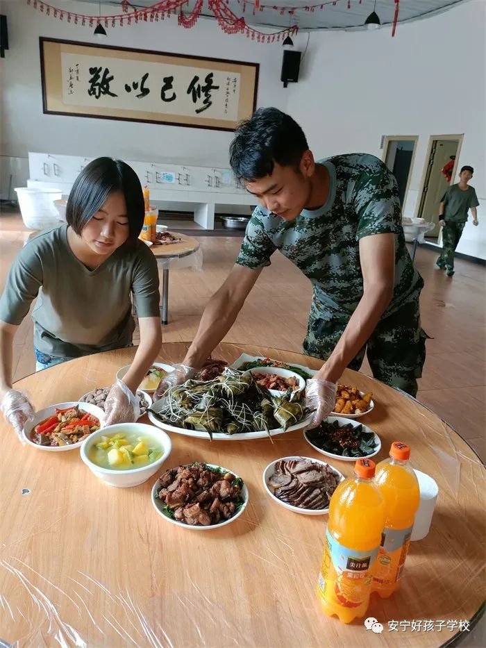 傍晚,一個(gè)個(gè)香氣撲鼻的“粽子”新鮮出爐端上了桌,一桌桌色香味俱全的盛宴便呈現(xiàn)在大家眼前。開飯前,尹校長向全校師生表示節(jié)日的問候與祝福,并語重心長地說道:“孩子們,今年的端午節(jié)對(duì)于大家來說,一定意義非凡,希望你們?cè)谶@個(gè)轉(zhuǎn)折點(diǎn),好好學(xué)習(xí),感恩自己的父母,做一個(gè)真正的好孩子,做一個(gè)對(duì)社會(huì)有用的人”。聽著尹校長親切又有力量的一番話,孩子們感動(dòng)不已。隨后,在尹校長“端午節(jié)晚餐現(xiàn)在開席”的一聲令下后,大家共同舉杯正式開始了晚宴。孩子們一邊吃著豐盛的晚餐,一邊迫不及待地解開升騰著熱氣的粽子,心滿意足地品嘗著自己的“作品”,笑容分外甜蜜。席間,尹校長還親切地走到孩子們中間敬茶祝福。看著教學(xué)中嚴(yán)厲的校長,生活中卻是如此關(guān)切地噓寒問暖、和藹可親,像父母,又像兄長,同學(xué)們高興不已!鏡頭下,孩子們不時(shí)向父母老師道祝福,和同學(xué)相共勉。