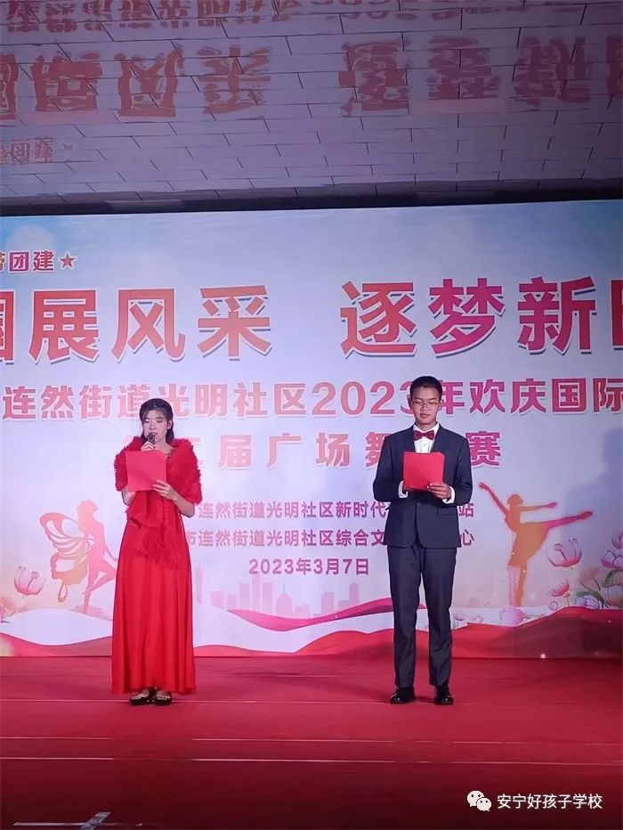 2023年3月7日晚,我校組織部分學(xué)生參加了安寧市連然街道光明社區(qū)舉辦的“巾幗展風(fēng)采 逐夢新時代”2023年歡慶國際婦女節(jié)暨第二屆廣場舞大賽活動;顒釉谖倚擅≈鞒秩藷崆檠笠绲慕榻B和觀眾們熱烈的掌聲中拉開帷幕。