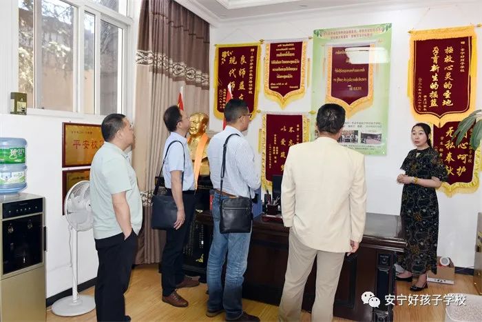 瞿會長一行首先參觀了學(xué)校辦公樓、學(xué)生餐廳、教學(xué)樓、學(xué)生宿舍、心理輔導(dǎo)室等硬件設(shè)施,隨后與我校心理教研組長趙松瑞老師做了沙盤交流,最后在多媒體教室觀看了教學(xué)活動短片。其間,我校副校長李新紅就學(xué)校的辦學(xué)理念、發(fā)展歷程、管理模式、辦學(xué)特色、辦學(xué)戰(zhàn)略定位、辦學(xué)效益等多項內(nèi)容逐一向領(lǐng)導(dǎo)們做了詳細(xì)介紹。執(zhí)行校長尹斌對領(lǐng)導(dǎo)們提出的問題一一做了解答,并就家庭教育做了深入交流。當(dāng)看著接待室那面印著老撾文的錦旗,瞿會長非常震驚,他從未想過學(xué)校的生源除了省內(nèi)、國內(nèi)各地,竟也延伸到了國外,非常驚嘆學(xué)校的影響力。
