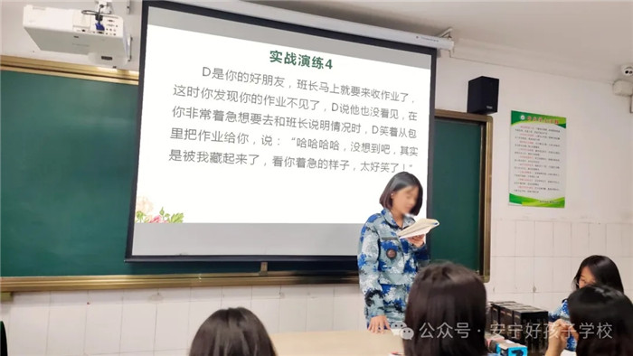 緊接著,張老師首先讓孩子們理解“和而不同”的內(nèi)涵,讓孩子們明白在人與人的相處中,既應(yīng)當(dāng)尊重他人的需求與愿望,同時(shí)也要堅(jiān)守個(gè)人的界限與原則,清晰界定個(gè)人的能力范圍與心理舒適區(qū),避免過(guò)度犧牲自我導(dǎo)致的疲憊與不滿。然后通過(guò)“如何在拒絕中實(shí)踐‘和而不同’案例”,給孩子們傳授了“拒絕寶典”的精髓。