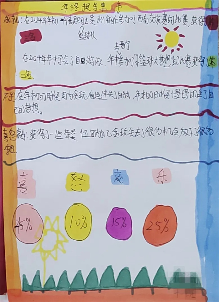 孩子們的“年終報(bào)告”各具特色,有的色彩豐富,有的創(chuàng)意十足,有的重點(diǎn)記錄了自己一整年的情緒起伏,有的則記錄了對(duì)自己意義非凡的事件,還有的書(shū)寫(xiě)了成長(zhǎng)與感悟……