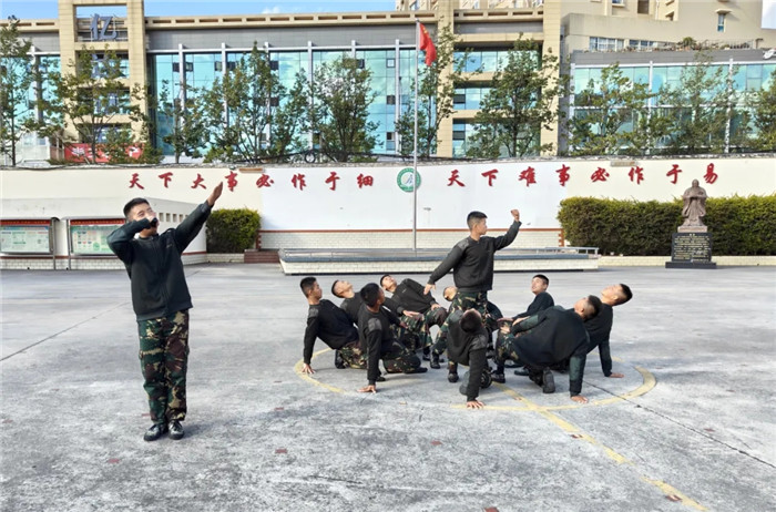 其間,三個方隊穿插表演的《擒敵拳》氣貫長虹。男生們剛勁有力,步伐穩(wěn)健,毫不拖泥帶水,看得人熱血沸騰;女生們英姿颯爽,意氣風發(fā),每一招都虎虎生風,盡顯英勇之姿。整個表演過程中,每個方隊成員們配合默契,動作整齊劃一,每一個抬手、每一個踢腿都充滿力量,彰顯著他們平日里刻苦訓練的成果。