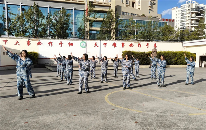 下午三點,同學們軍容嚴整、英姿颯爽、斗志昂揚,集結在操場等待檢閱。在雄壯的國歌聲中,鮮艷的五星紅旗冉冉升起,匯報表演正式拉開帷幕。