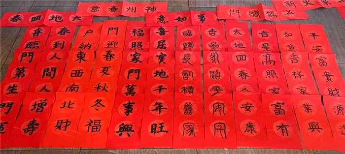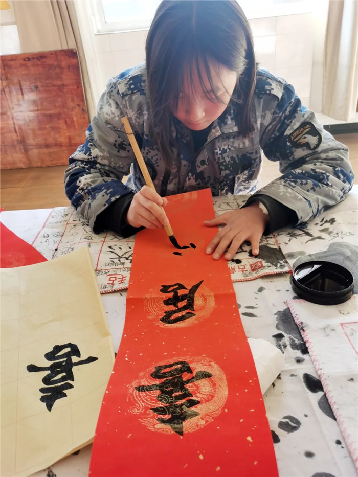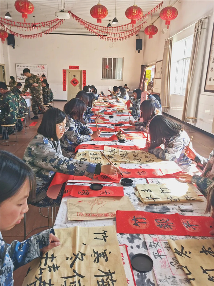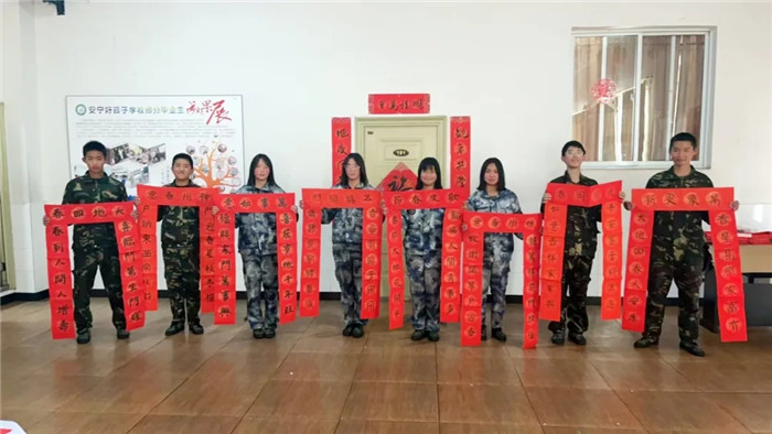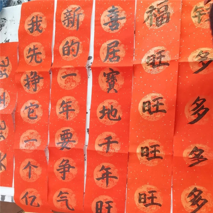 春聯(lián)紙上,孩子們筆走龍蛇。有的筆法雖顯稚嫩,卻充滿童趣;有的運筆嫻熟,字體剛勁有力。春聯(lián)內(nèi)容豐富多樣,有贊頌祖國繁榮昌盛的豪邁之語,有抒發(fā)家庭幸福美滿的溫馨之言,還有祈求學業(yè)進步的懇切之詞。不一會兒,一副副對仗工整、寓意吉祥的精妙詞句便在同學們的筆下應運而生,傳遞出的皆是對新年的美好祝愿。老師寫的福字更是獨具特色,雄渾大氣,無不飽含著對幸福生活的美好向往,F(xiàn)場,紅彤彤的紙張映照著孩子們燦爛的笑顏,新春的喜悅氣息如春風般撲面而來。